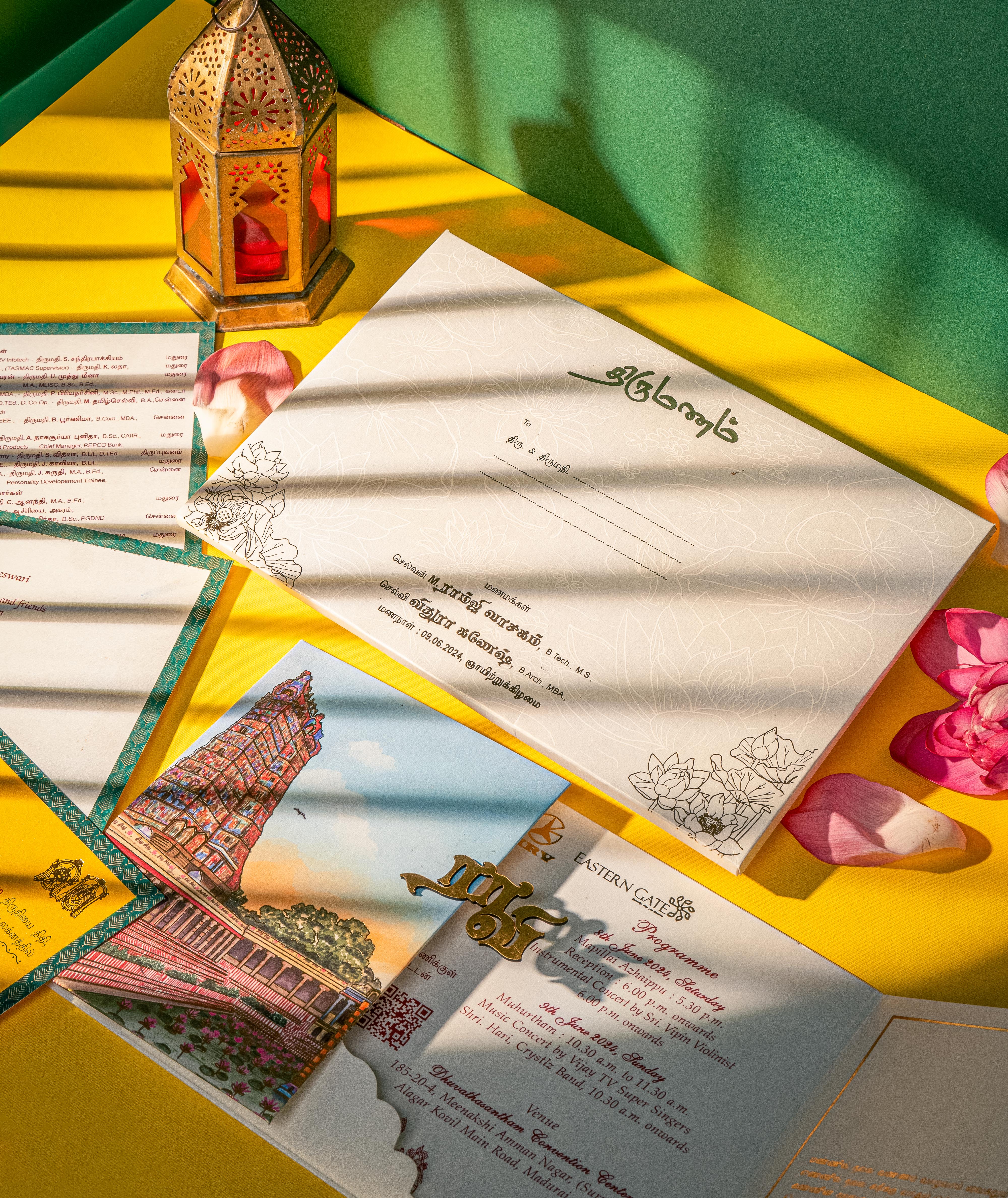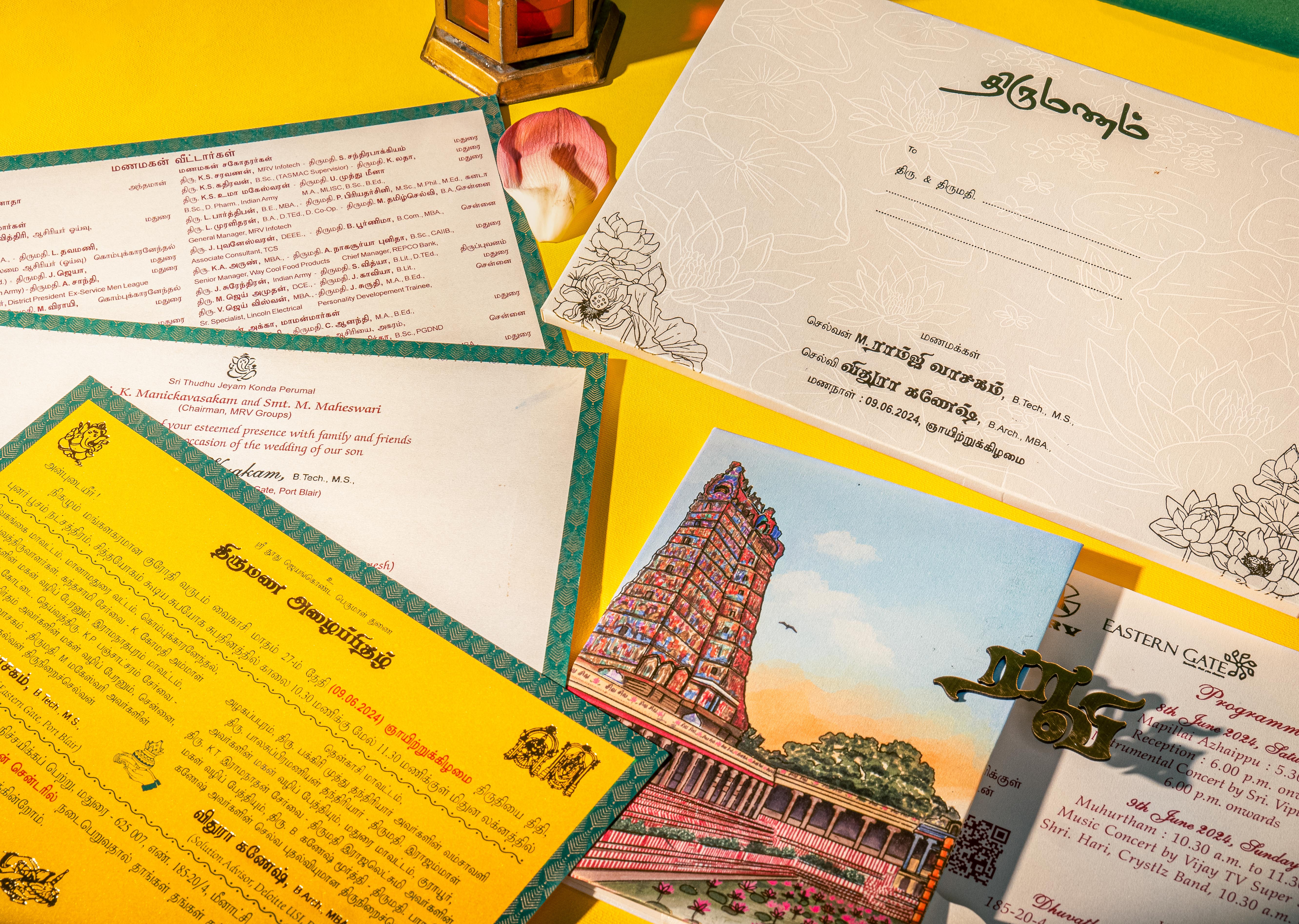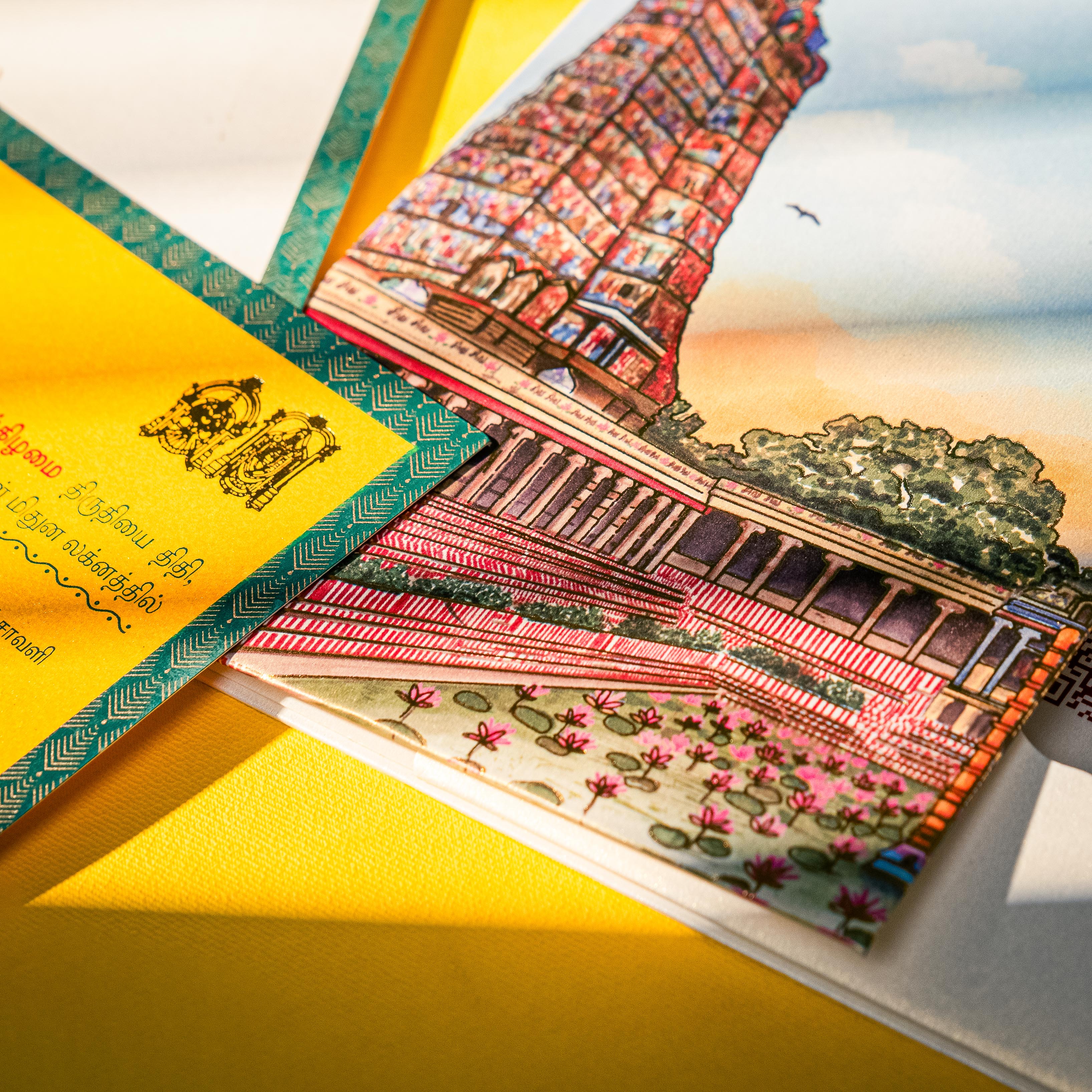 A graceful wedding invitation blending traditional temple architecture with modern minimalism. Featuring a beautifully illustrated temple gopuram alongside soft floral line art, this design symbolizes heritage, devotion, and elegance. Ideal for muhurtham ceremonies and culturally rooted celebrations, it sets a sacred and refined tone for the wedding festivities.