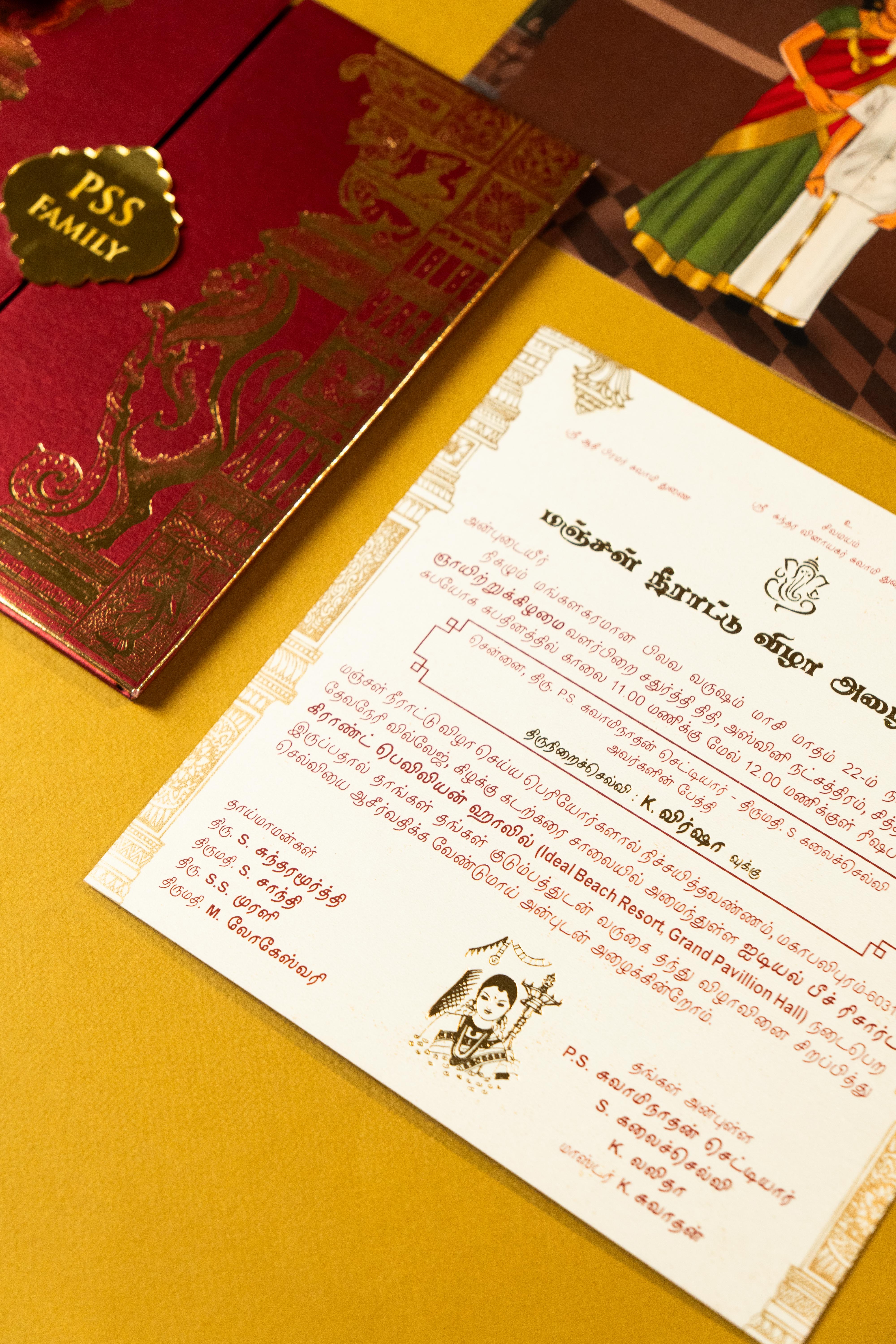 A celebration of tradition and family legacy, this invitation captures the essence of South Indian culture through bespoke hand-drawn portraits and intricate temple-inspired gold foil designs. With vivid colors, classic attire illustrations, and heritage patterns, it narrates a personal story, making it not just an invite but a cherished family keepsake. Perfect for weddings rooted in cultural pride and familial warmth.