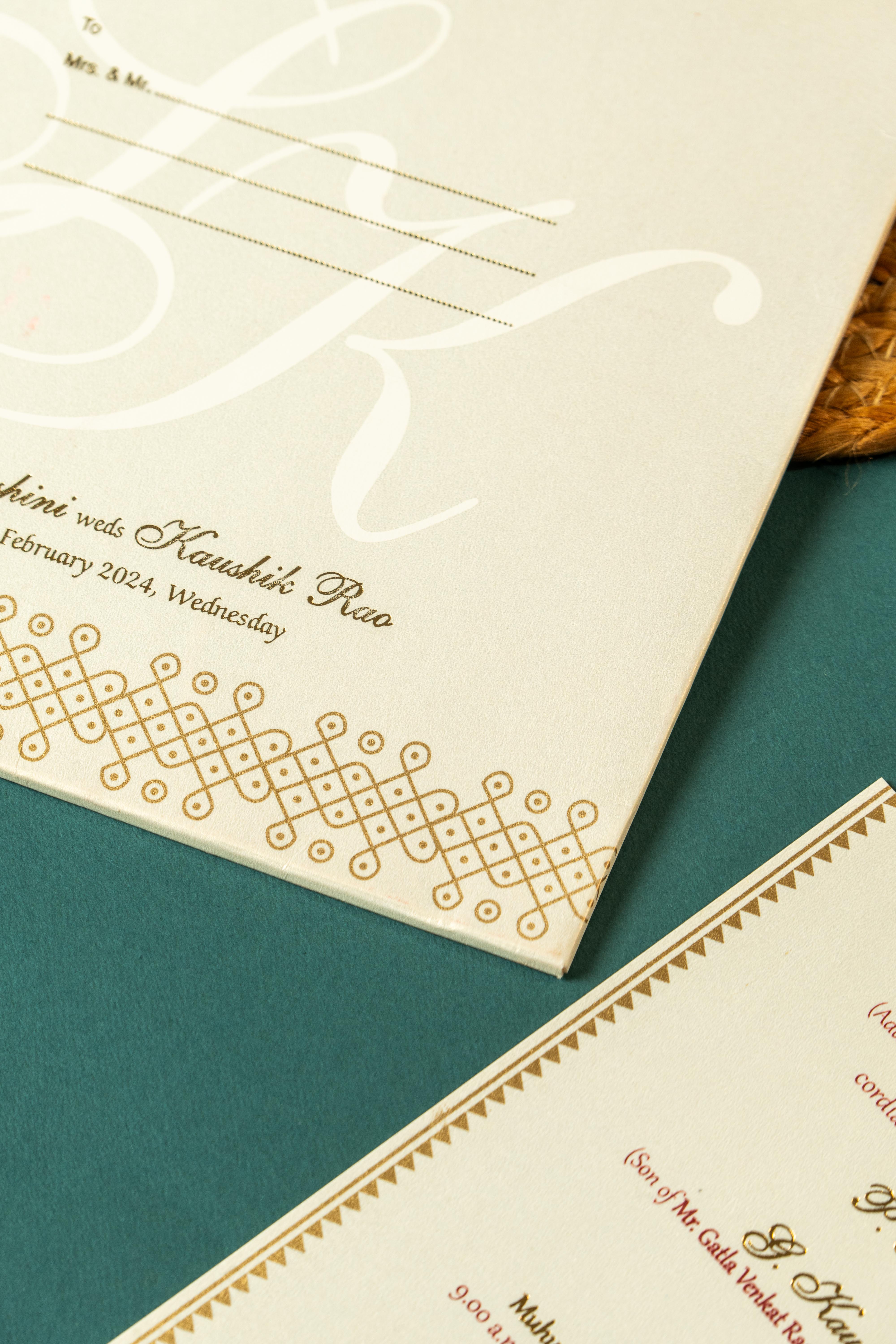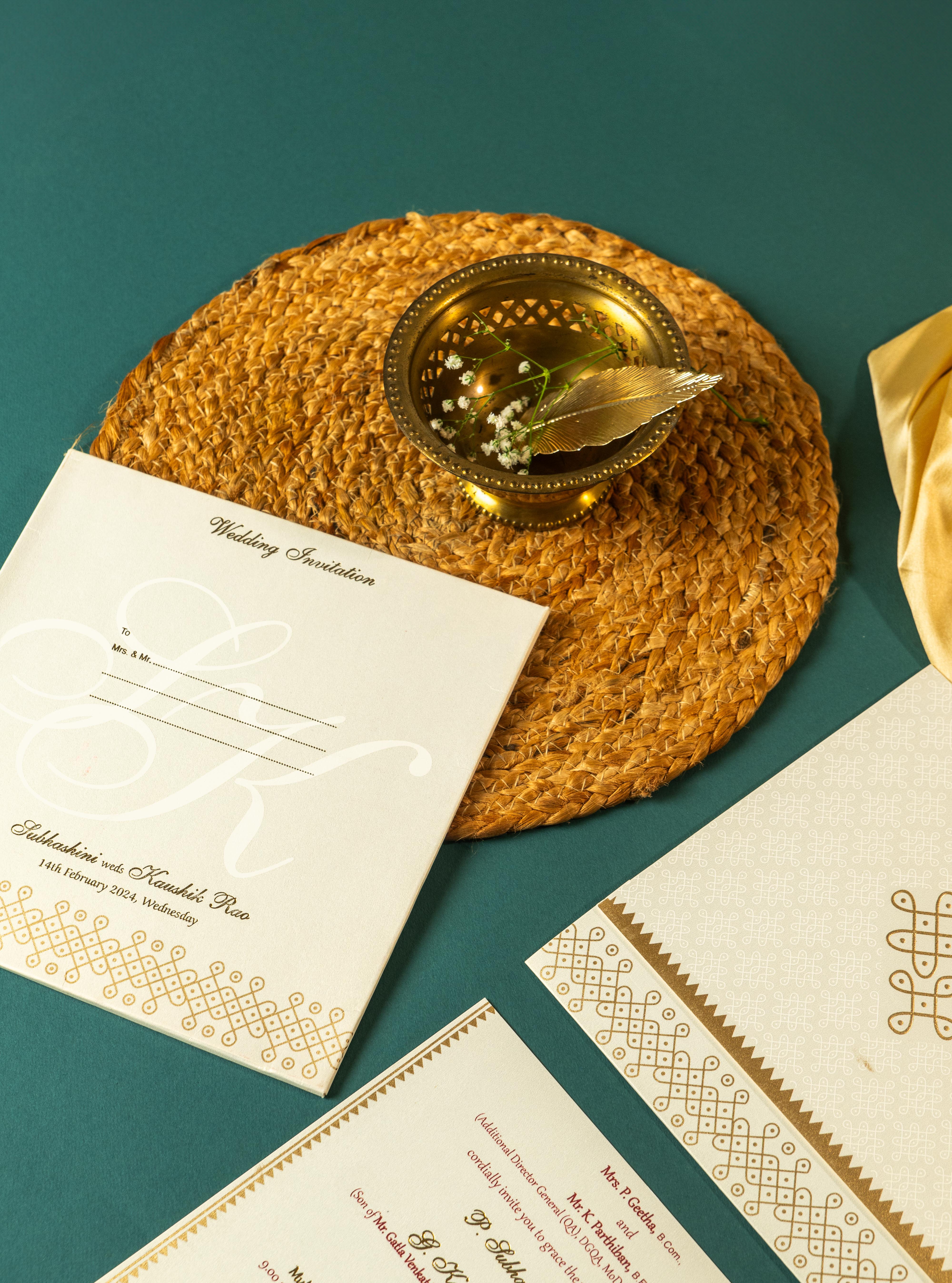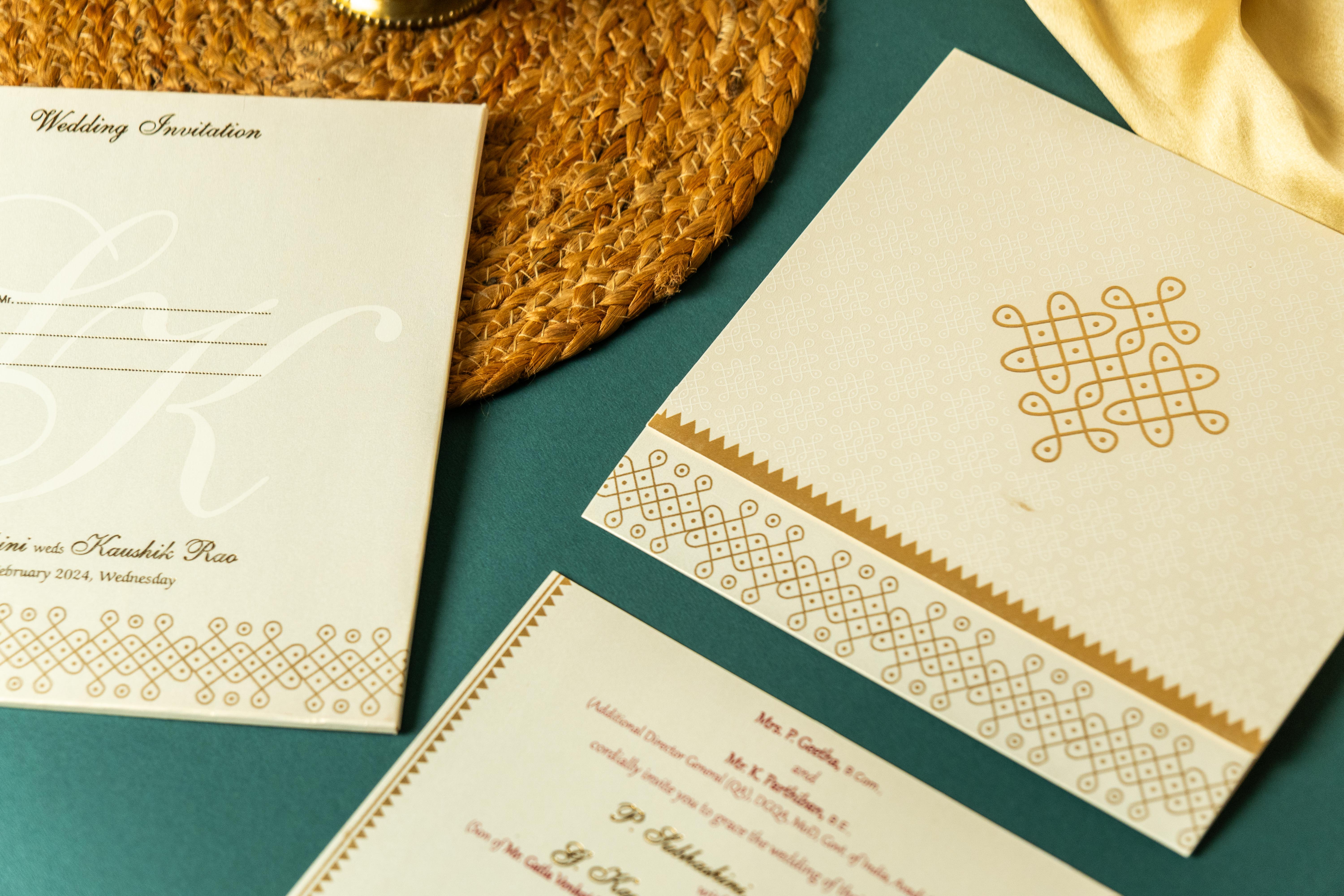 A sophisticated wedding invitation inspired by the traditional art of kolam (rangoli), symbolizing prosperity and auspicious beginnings. Featuring intricate geometric patterns in subtle gold foil against a minimal ivory backdrop, this design offers a perfect blend of cultural authenticity and contemporary elegance for intimate and traditional wedding ceremonies.