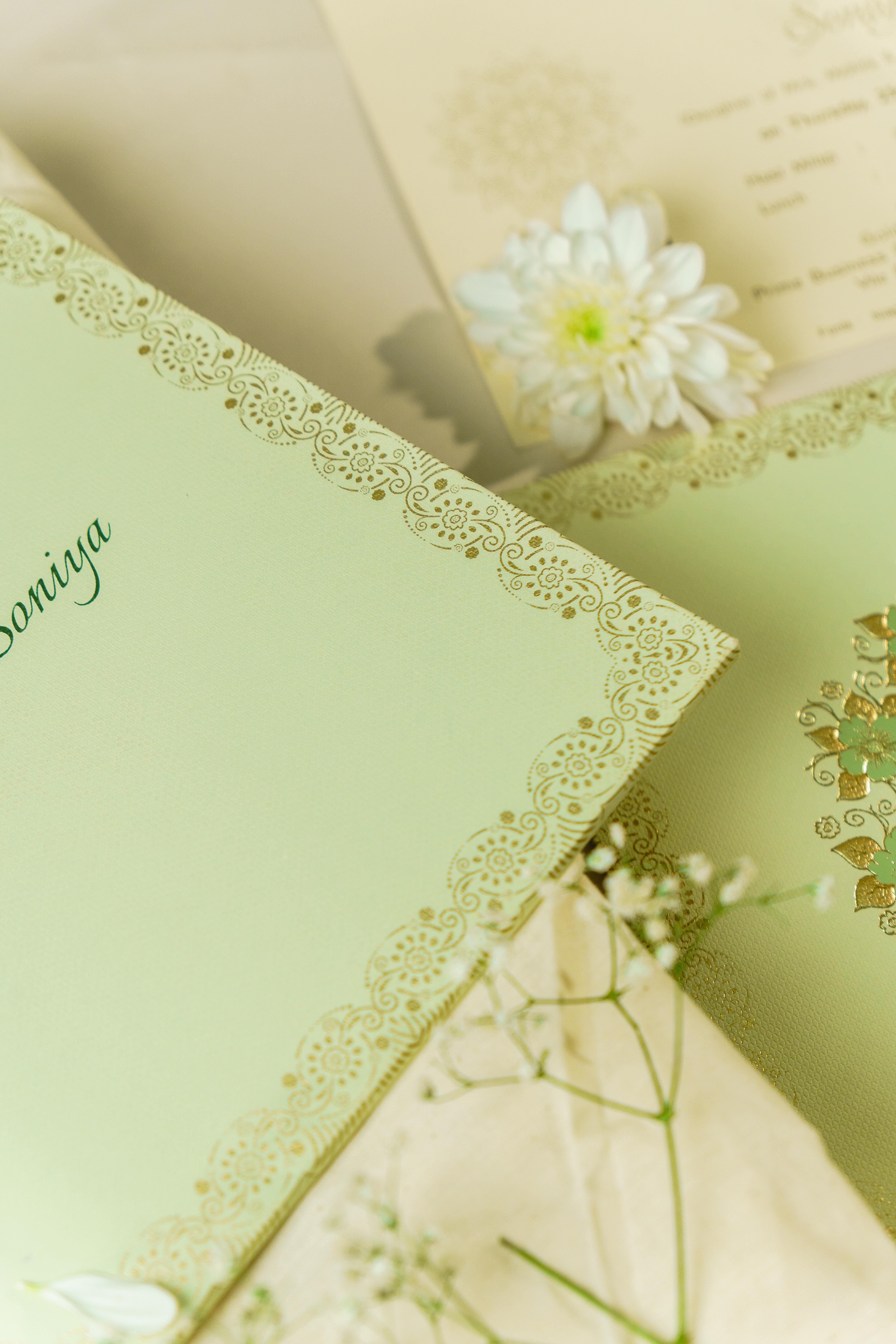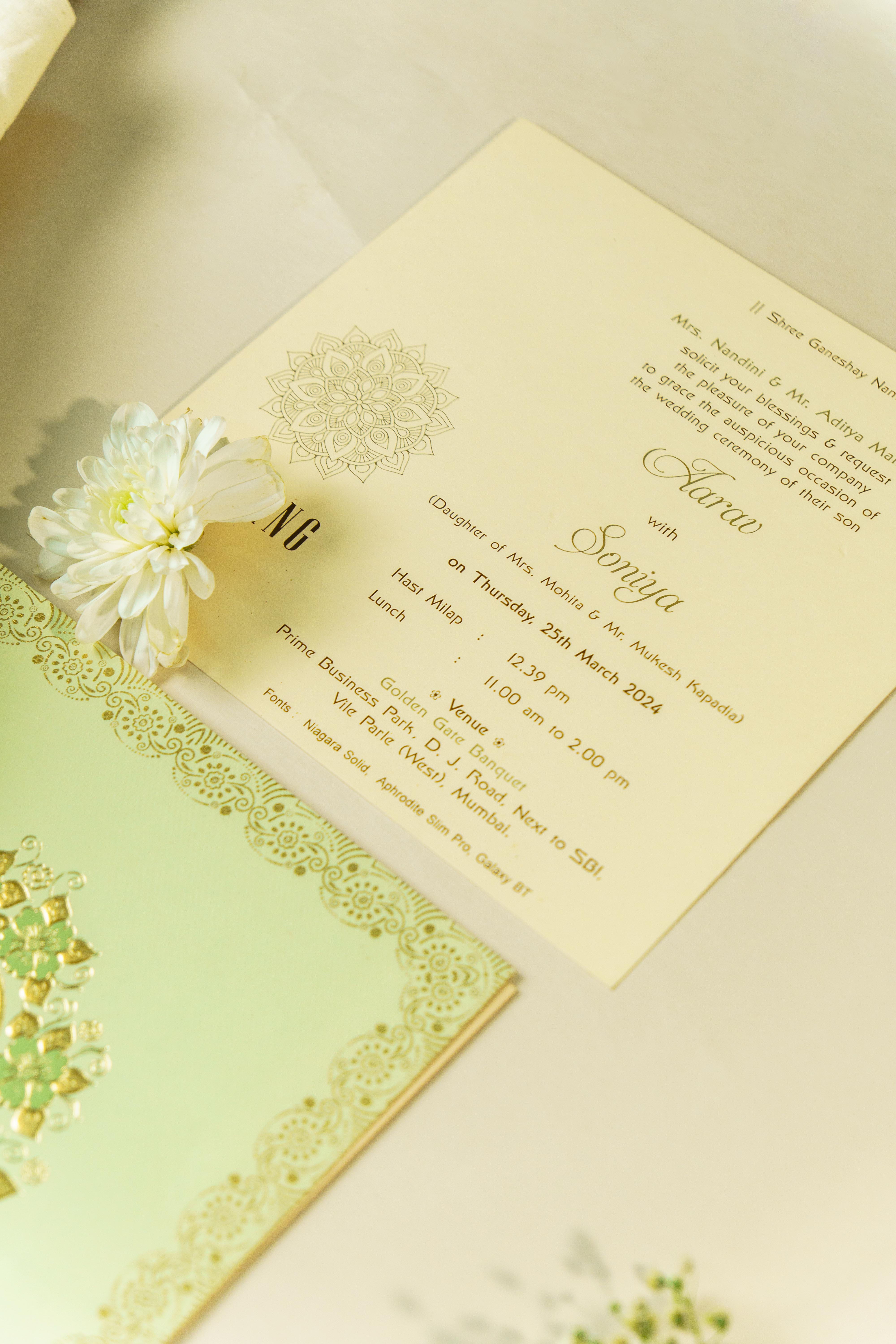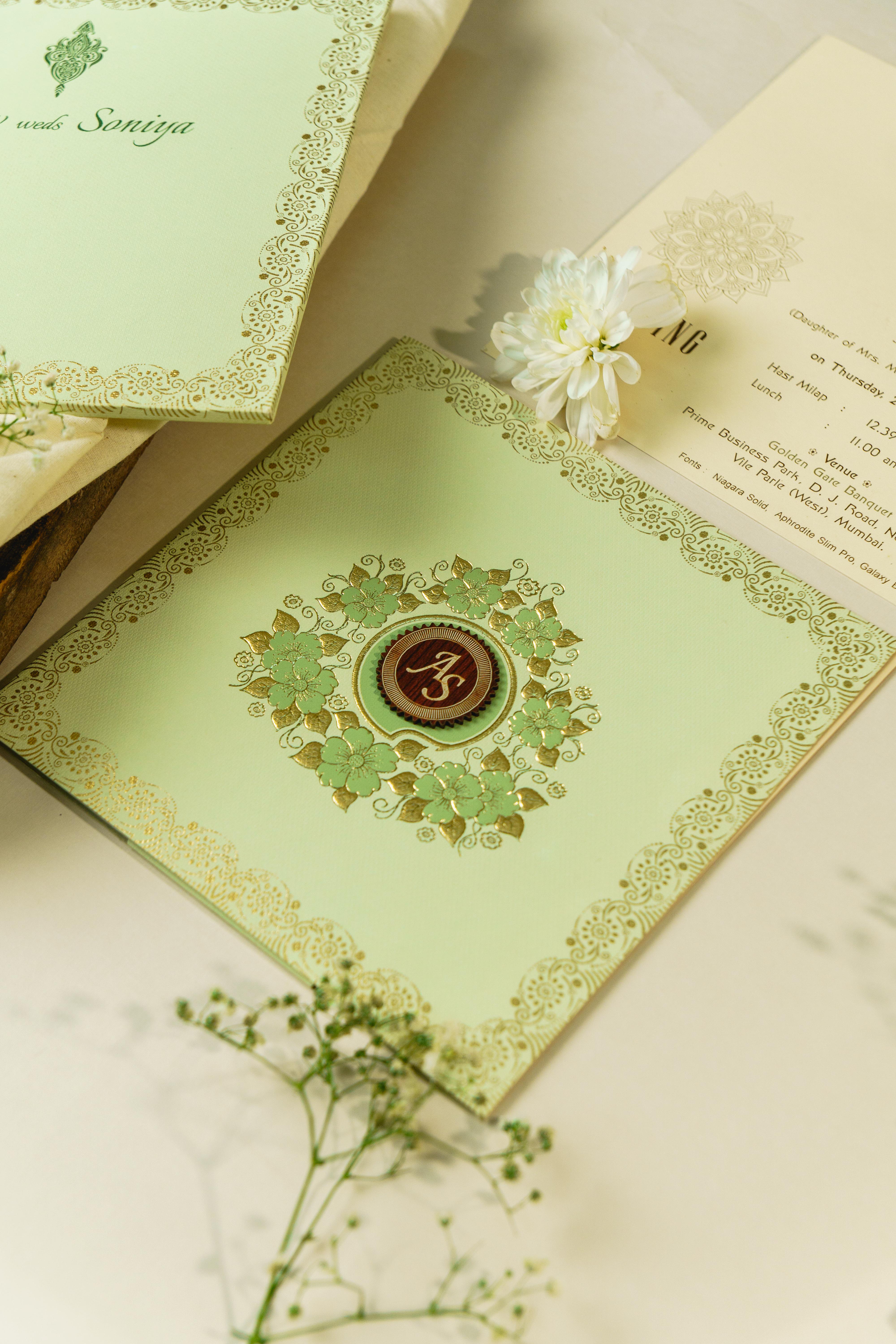 A refreshing take on traditional wedding invites, this design features soothing mint green tones adorned with intricate gold foiling and a regal floral mandala. The elegant monogram at the center adds a personalized touch, making it perfect for couples seeking a blend of classic opulence with a soft, contemporary palette.