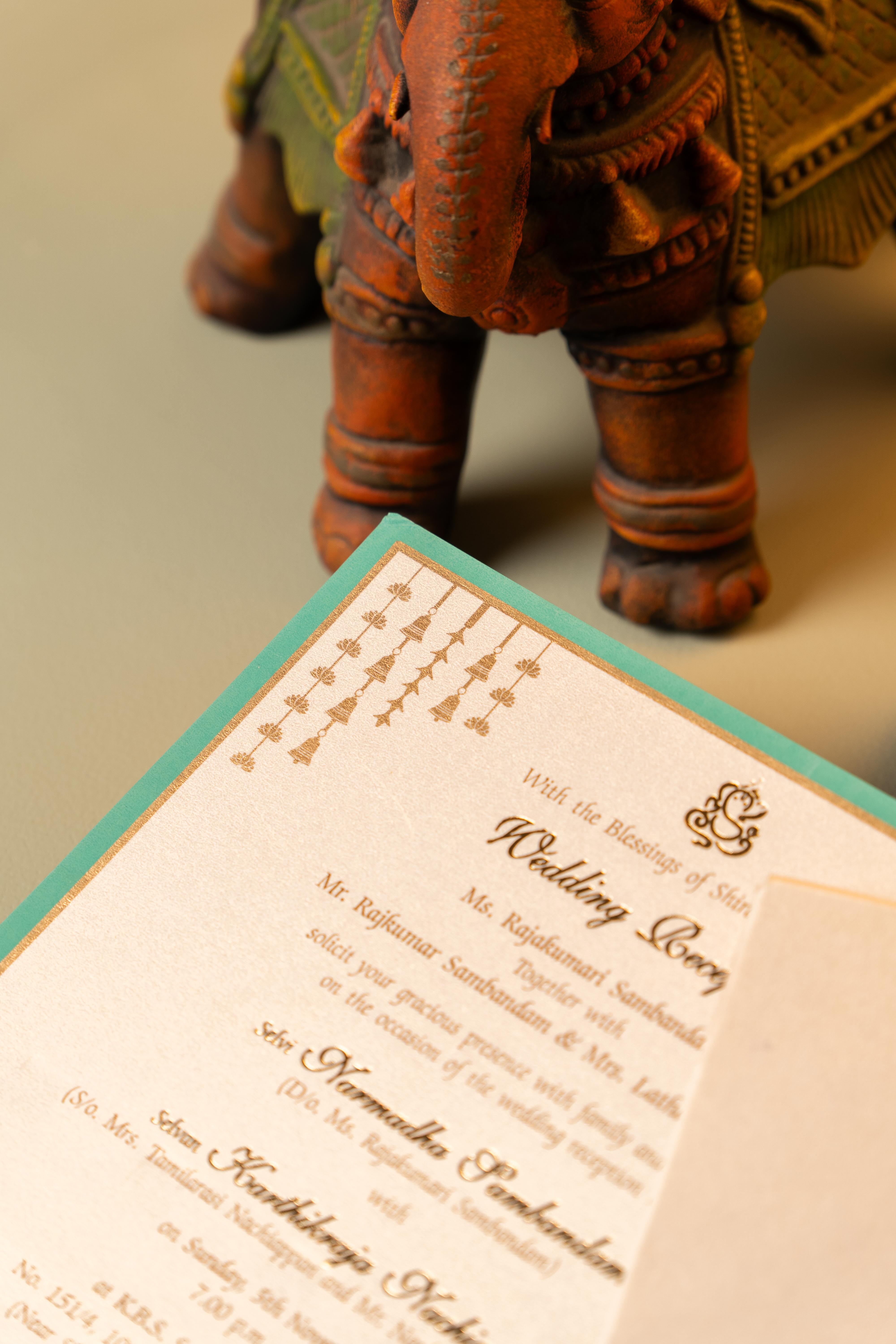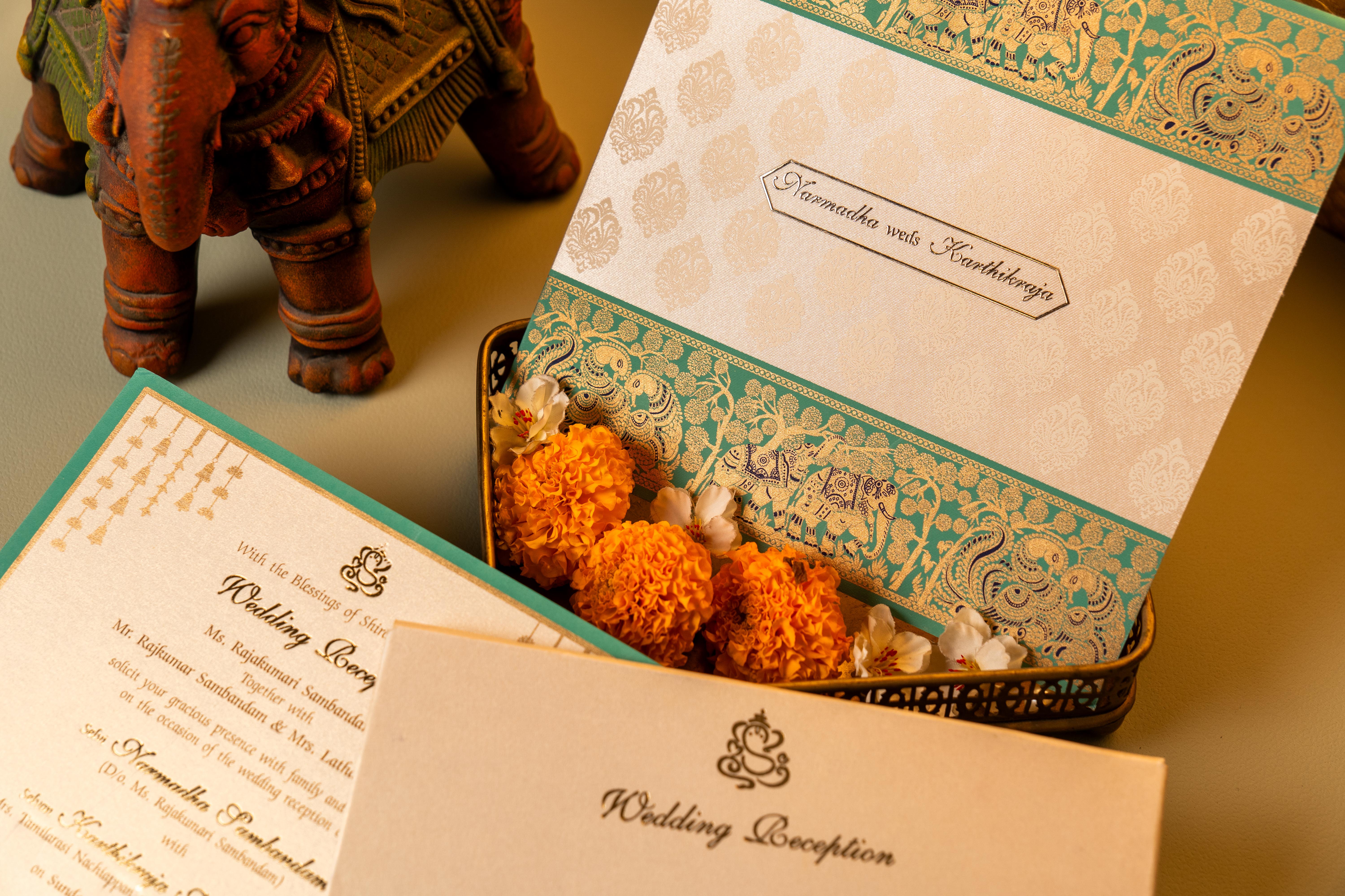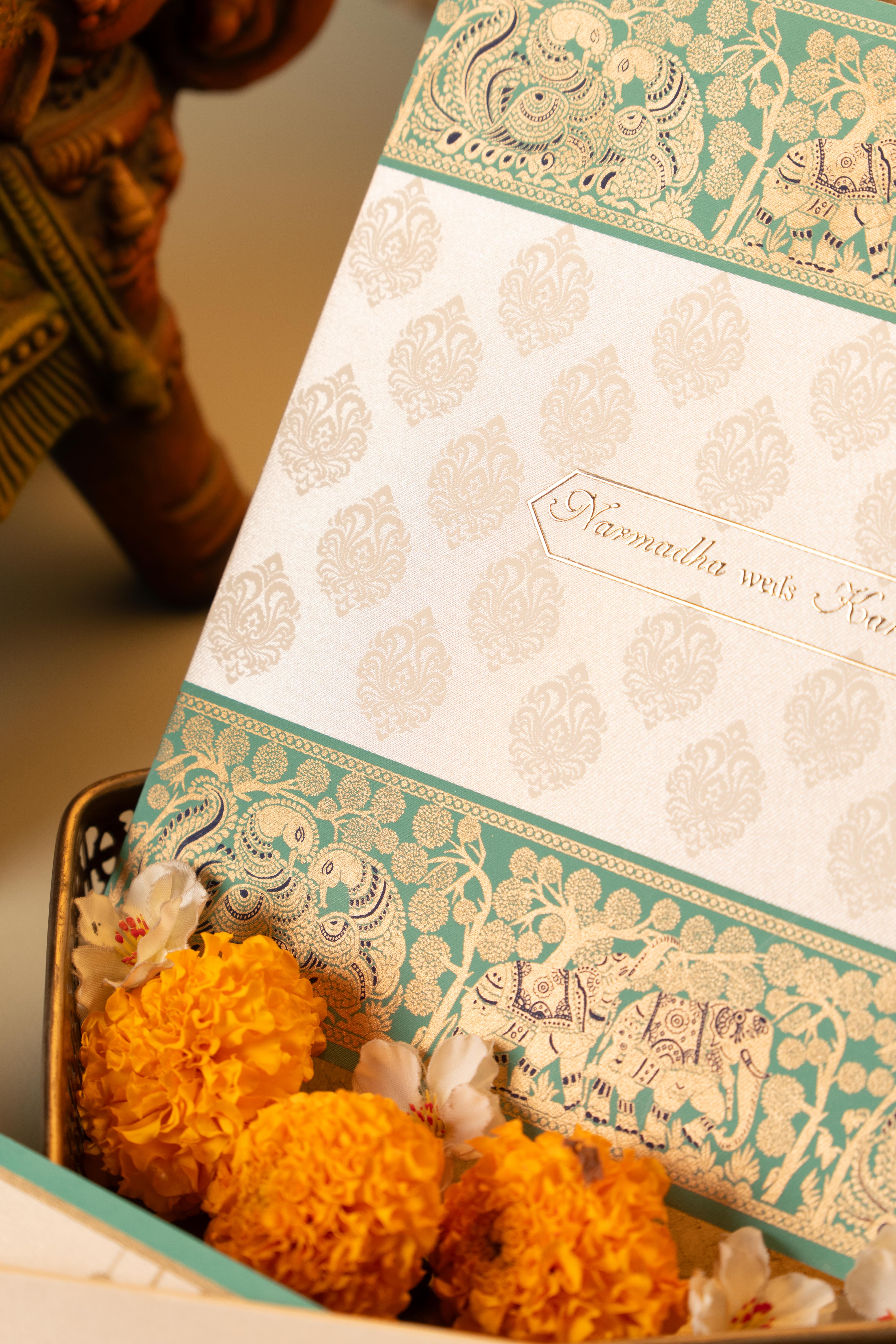 An opulent wedding invitation adorned with intricate gold-foiled peacock and elephant motifs, symbolizing prosperity, grace, and royal grandeur. The rich green border enhances the traditional charm, making it perfect for ceremonies steeped in cultural heritage and timeless elegance.