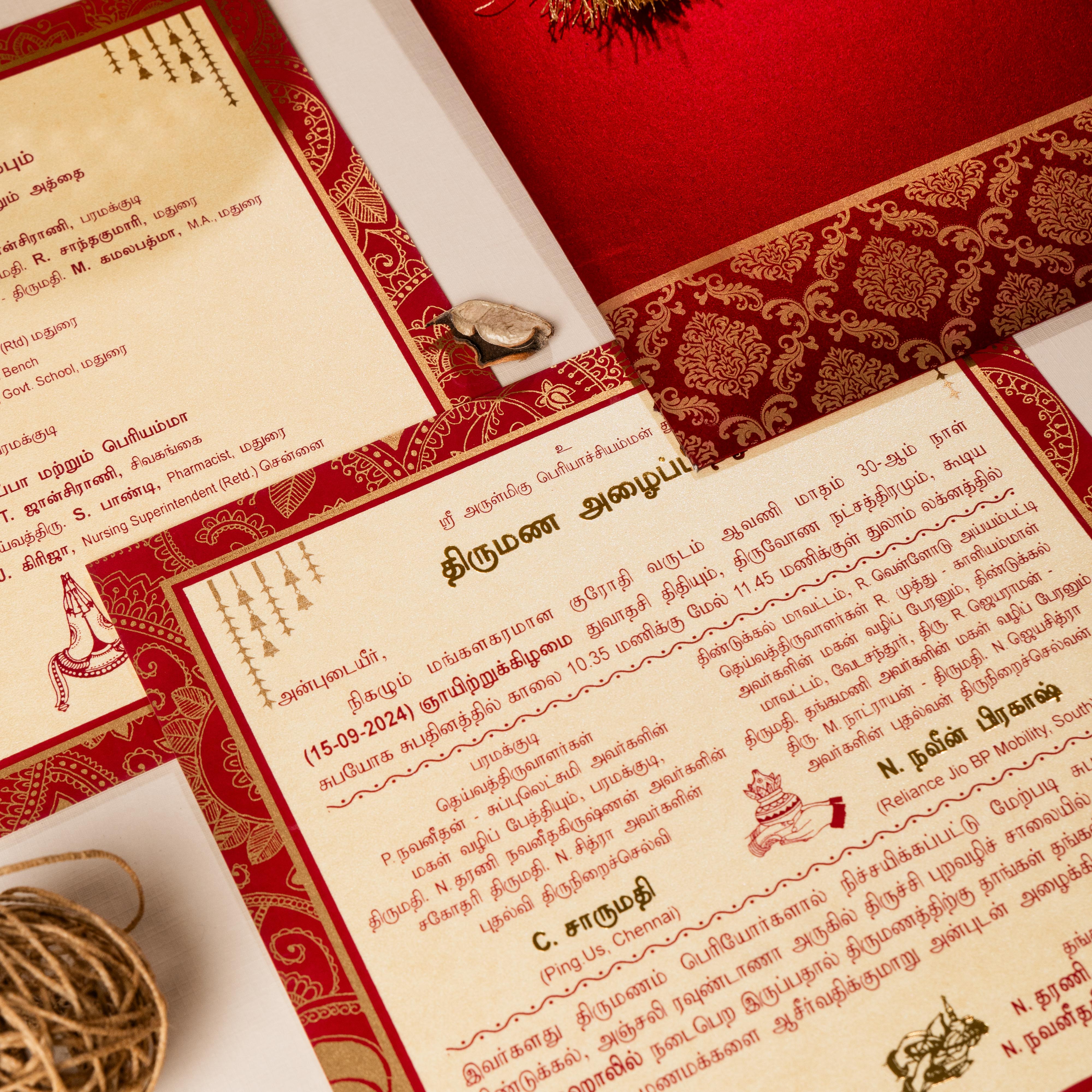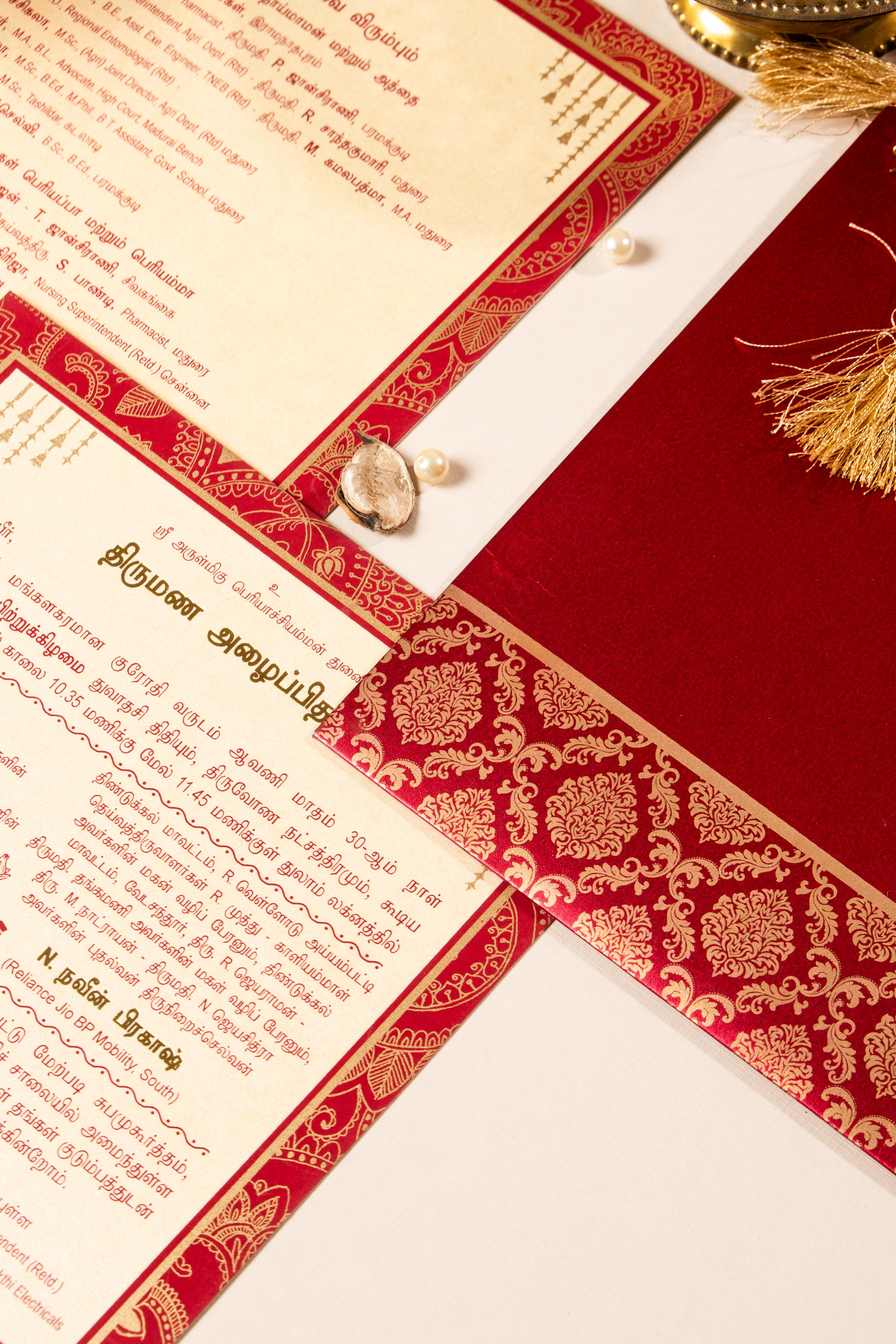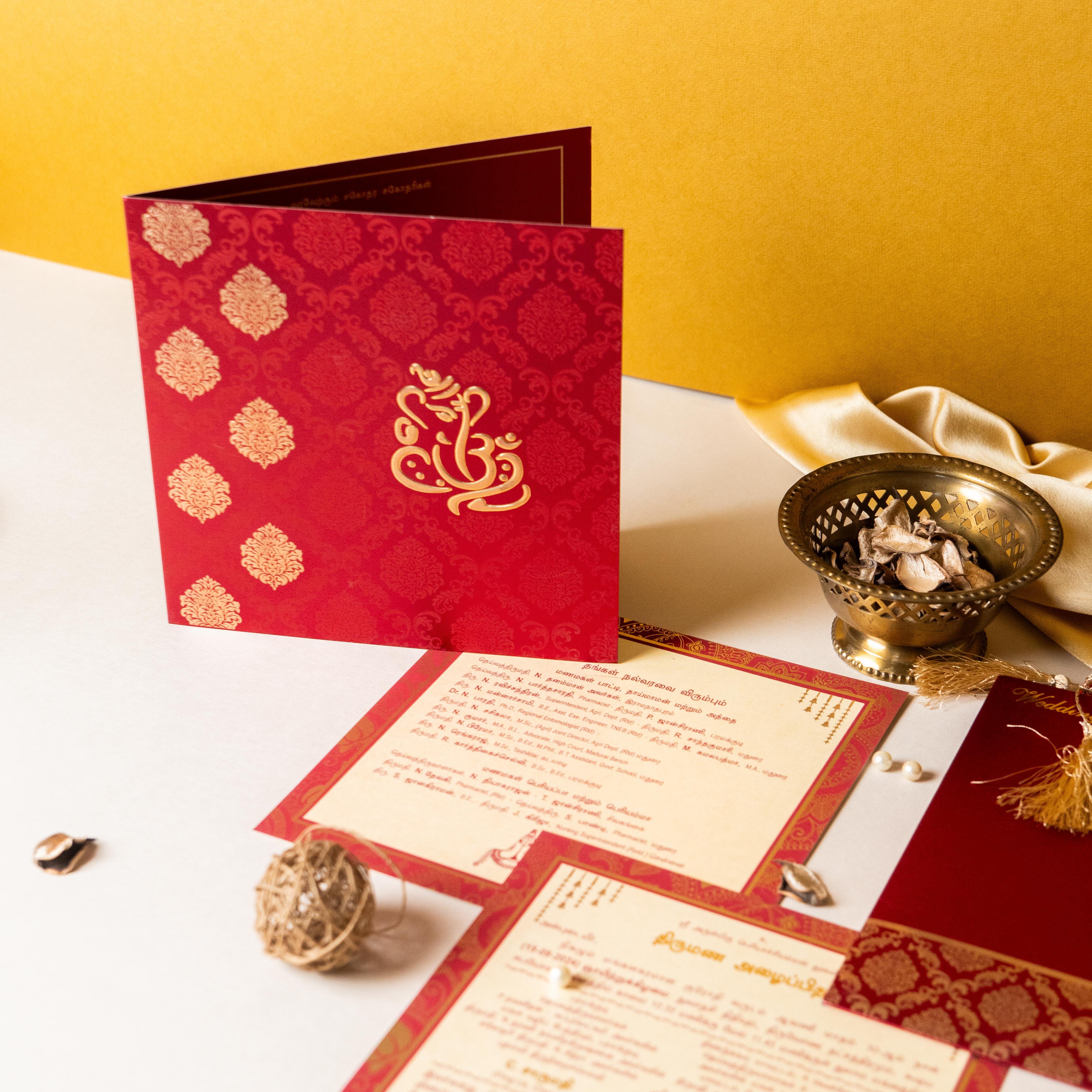 A grand wedding invitation that embodies traditional Indian opulence, featuring rich crimson hues, intricate damask patterns, and luxurious gold foil accents. Enhanced with an elegant tassel and monogram detailing, this invite is perfect for weddings that celebrate heritage, grandeur, and timeless elegance.