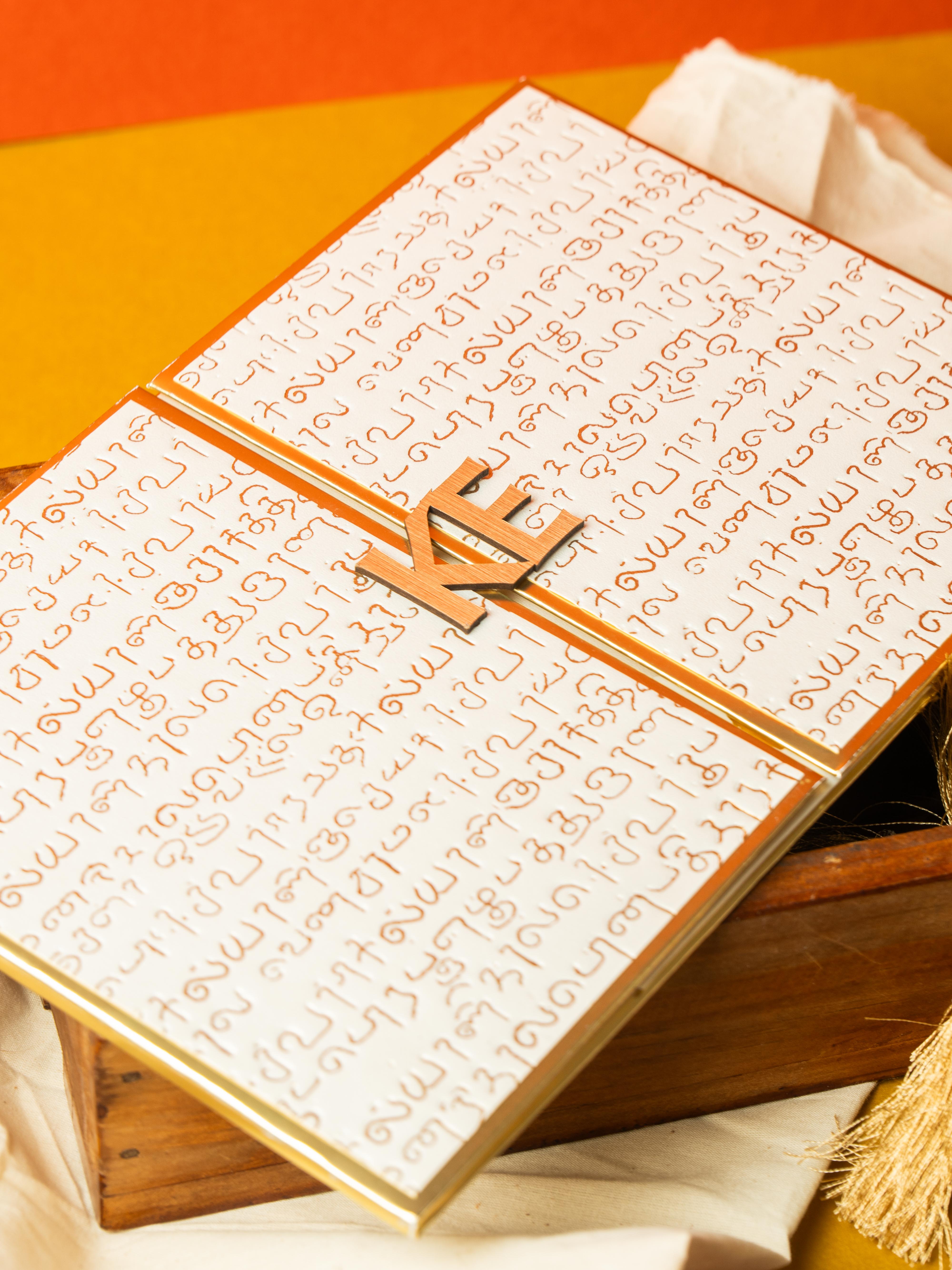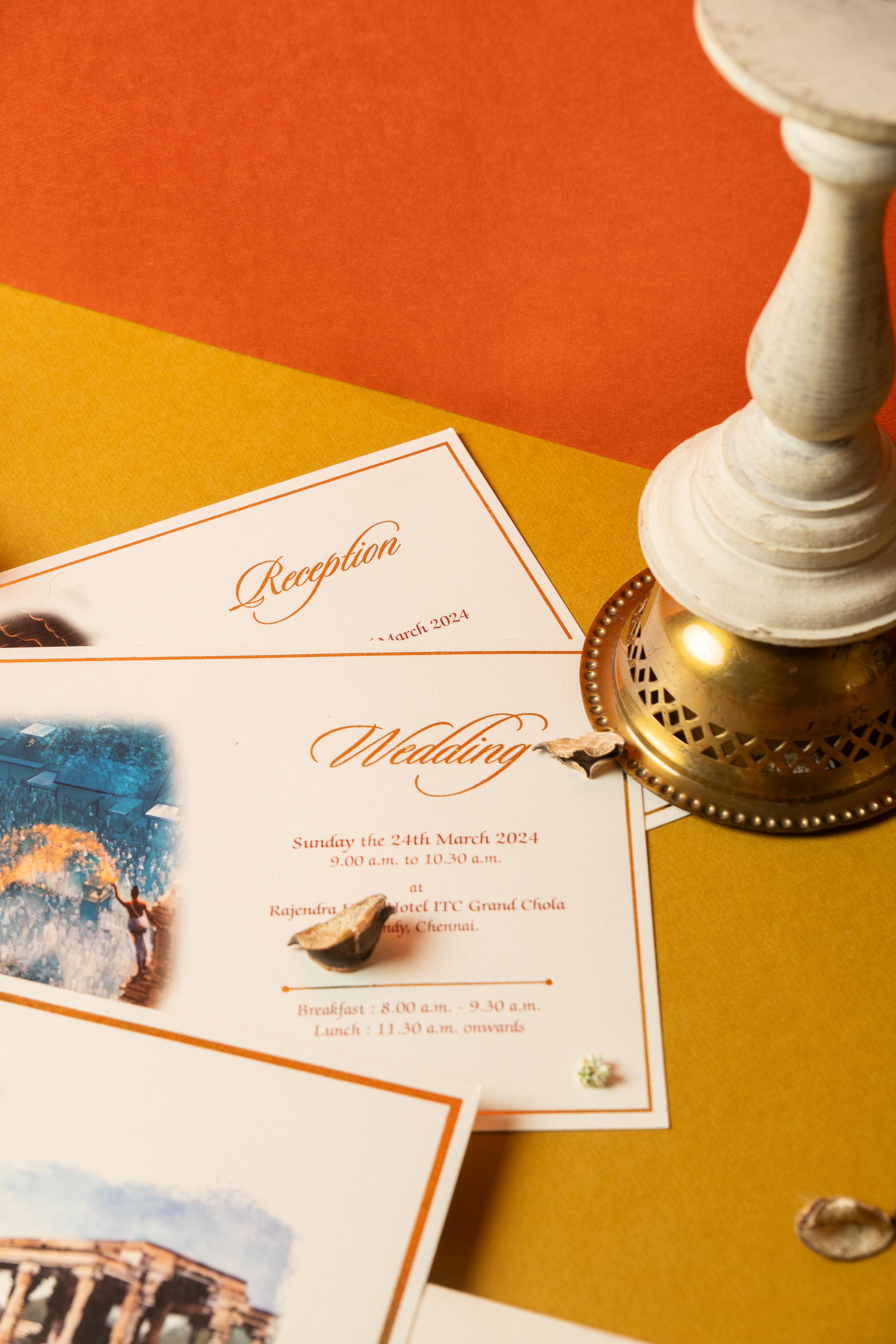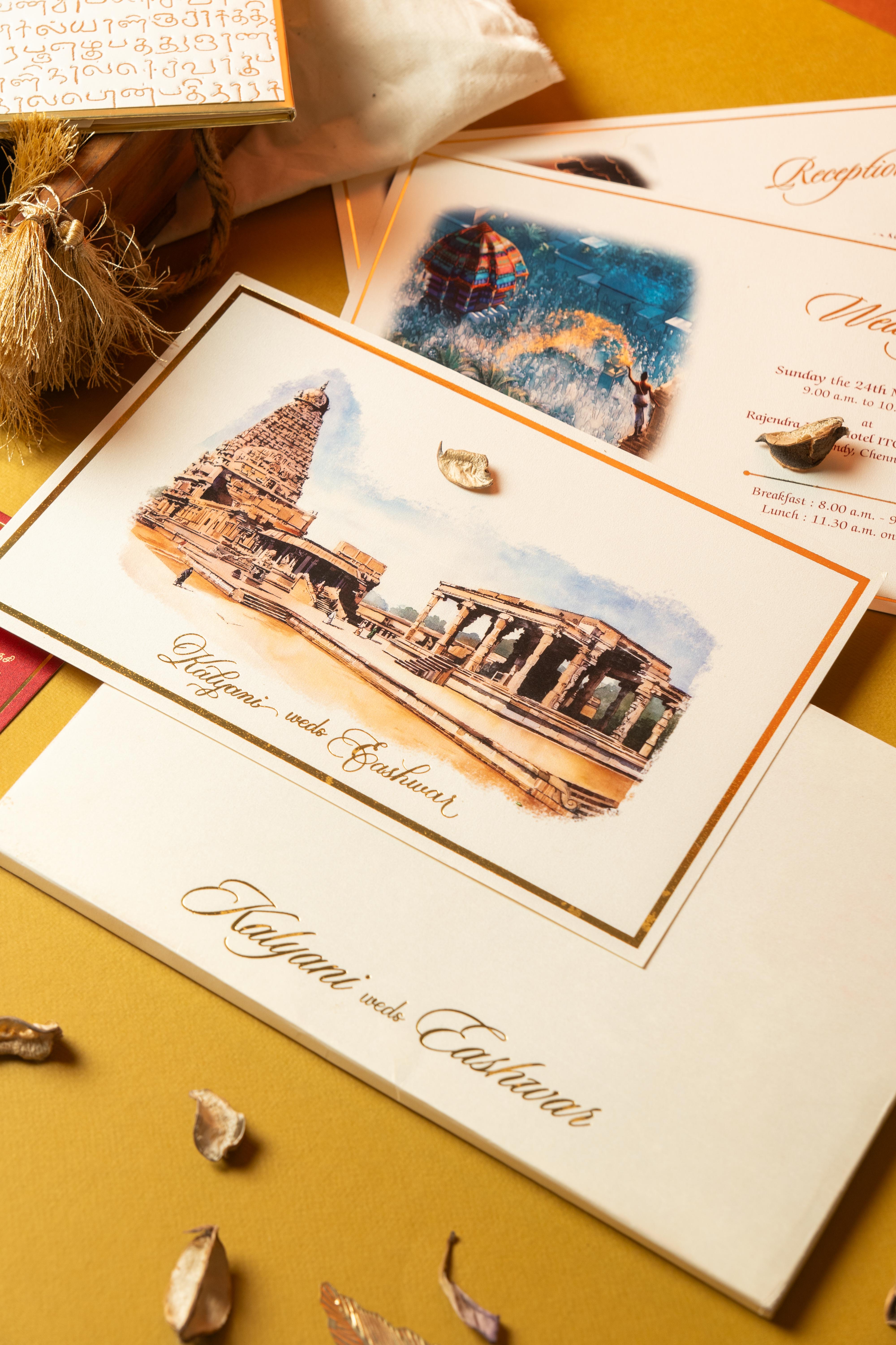 A culturally rich wedding invitation rooted in Tamil tradition, featuring embossed classical Tamil script, temple architecture illustrations, and watercolor visuals of historic landmarks. Paired with a bold monogram and gold accents, this design is ideal for couples seeking to honor their heritage with sophistication and artistic flair.