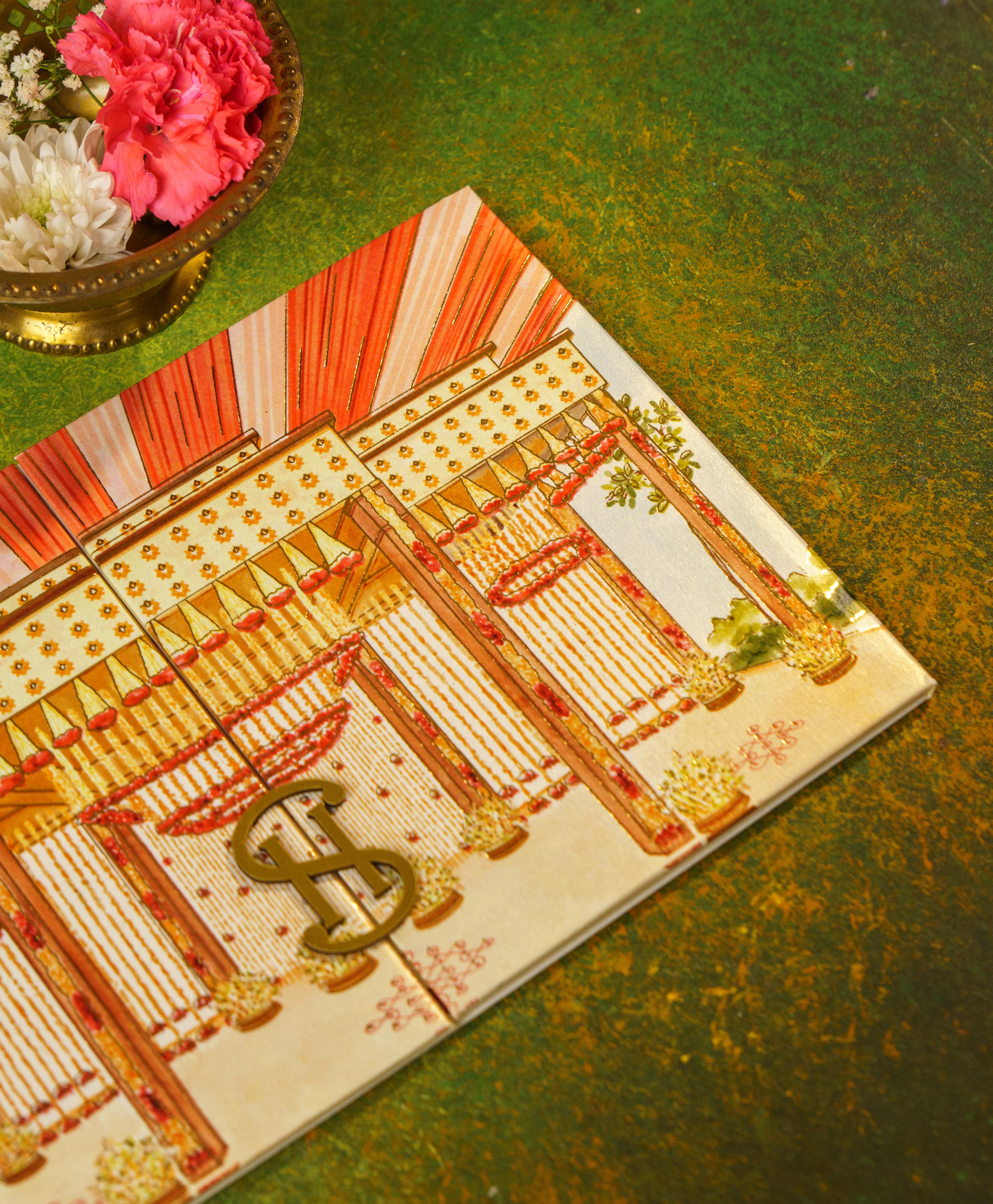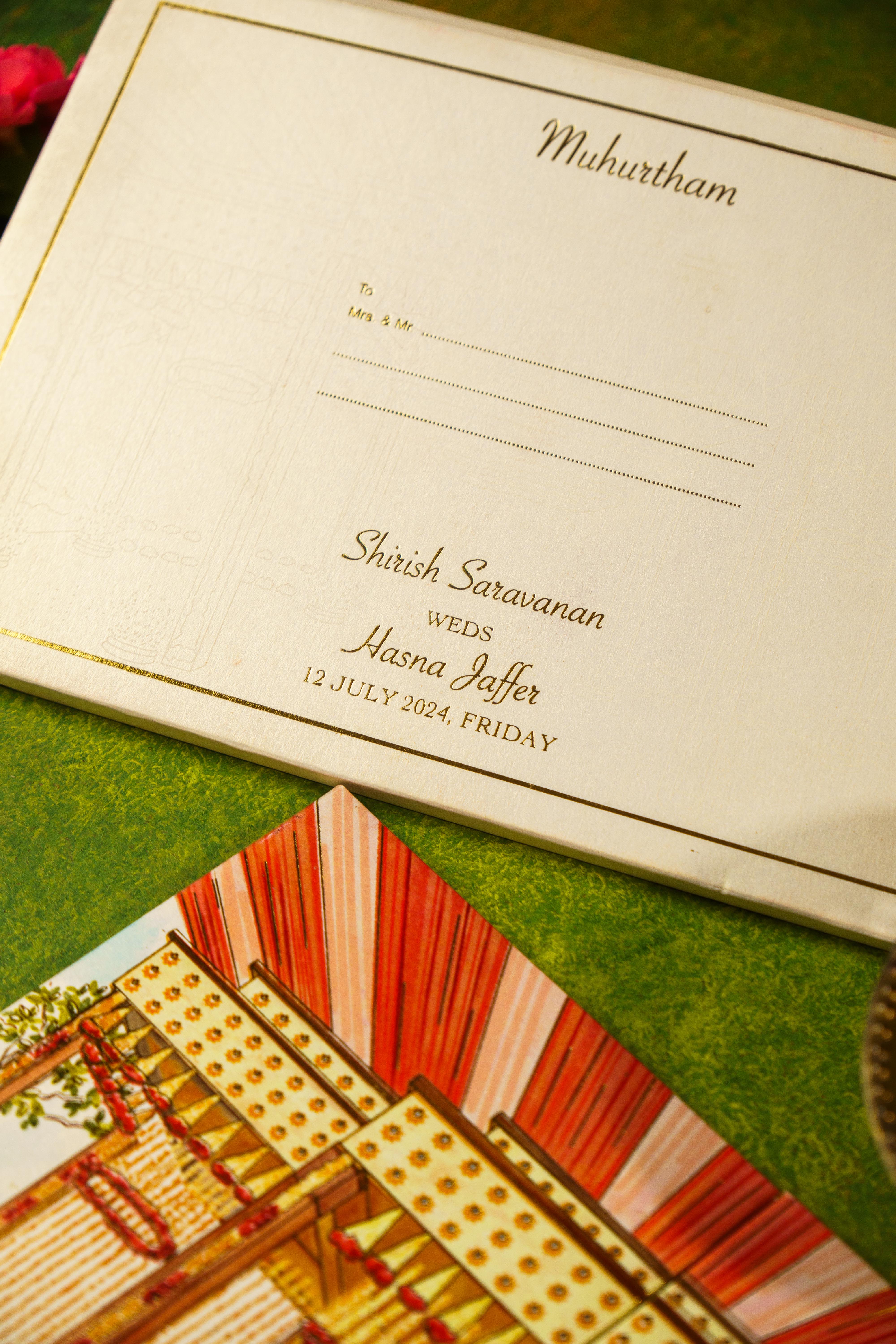 A beautifully crafted wedding invitation that pays homage to South Indian traditions, featuring an intricately illustrated temple mandap adorned with festive drapes and auspicious motifs. Designed to reflect the sacredness and grandeur of a traditional muhurtham ceremony, this invite is perfect for culturally rooted weddings seeking to honor heritage and rituals.