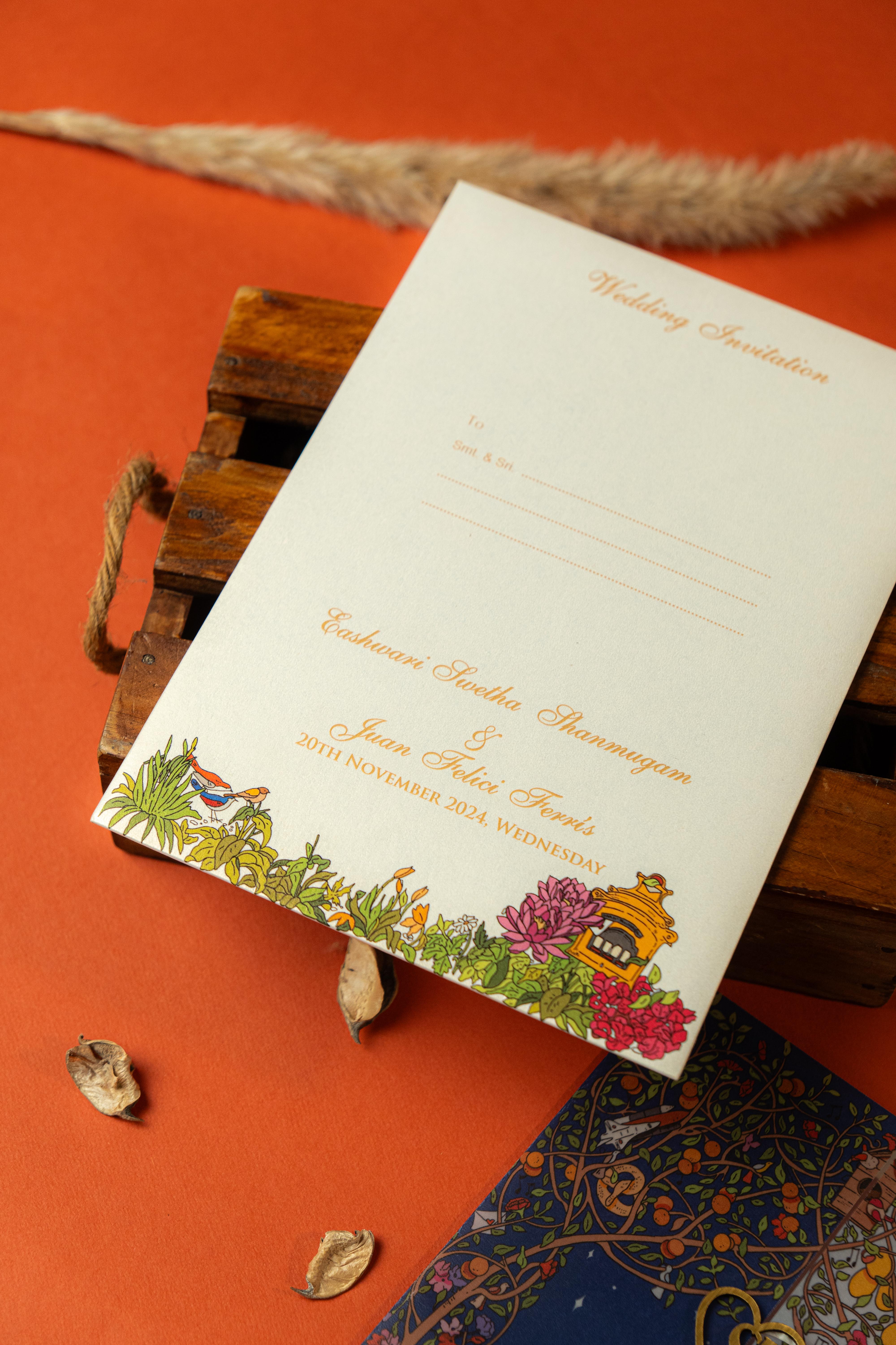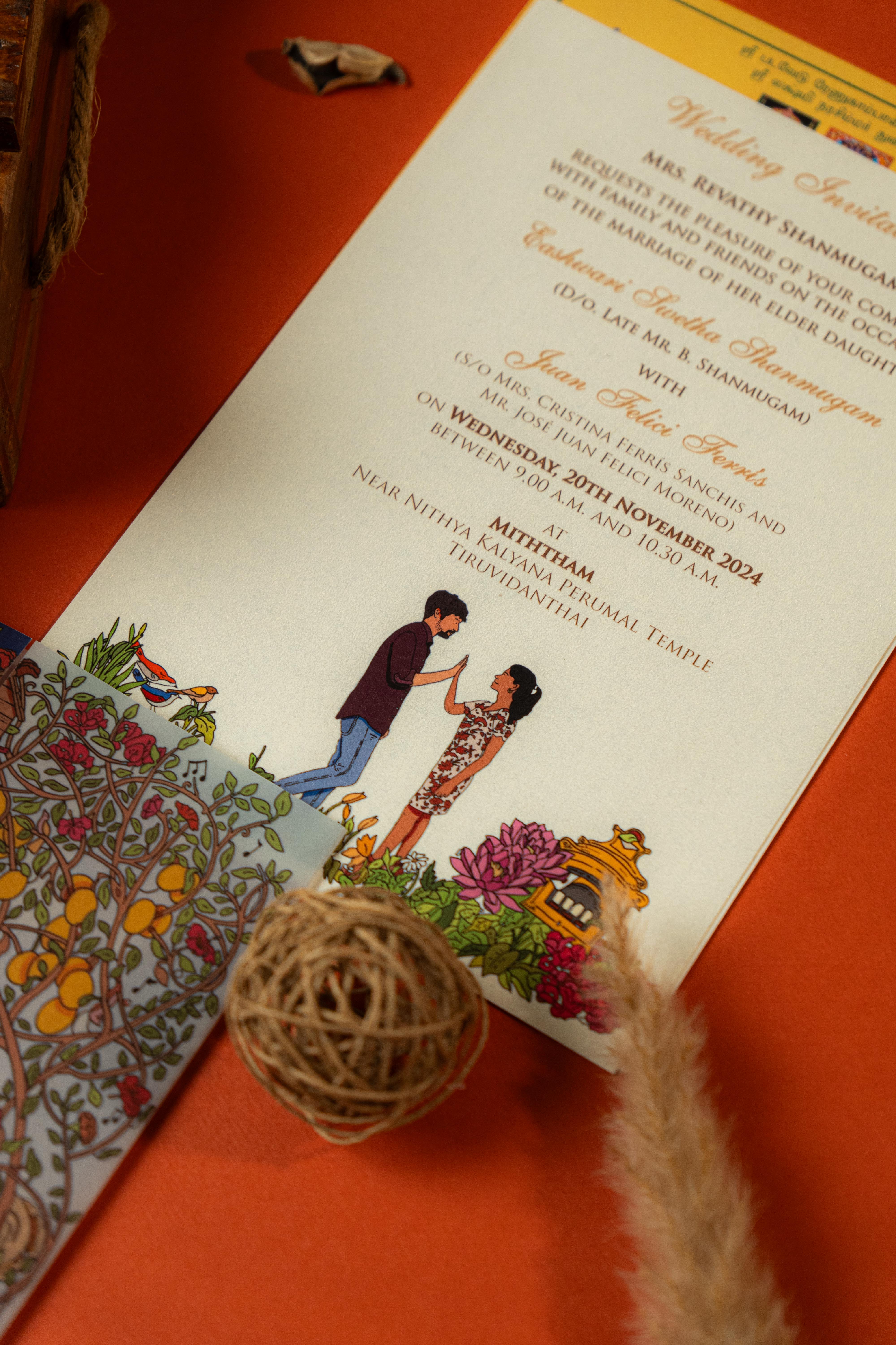 A lively and heartwarming wedding invitation that beautifully blends traditional elements with modern illustration. Featuring charming couple artwork amidst a garden of florals, temple motifs, and playful details, this design reflects a storybook-like vibe. Perfect for couples who wish to add a personal, cheerful touch to their wedding announcement.